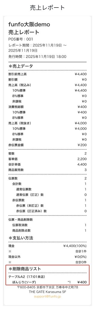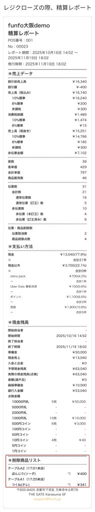 メールで送信されるレポートには、削除済み商品の欄が加わり、当日(または精算期間内)にテーブルから削除された商品の履歴を確認できます。