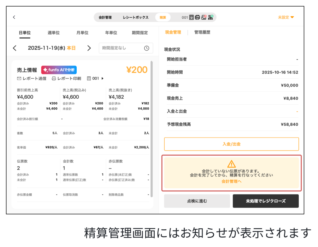 💡 新機能①:【精算画面】未会計伝票がある場合にお知らせを表示 💡