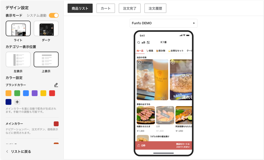 Studioでは、各店舗のブランドやコンセプトに合わせて、スマートフォンの注文画面のカラーや表示レイアウトを自由に調整できます。