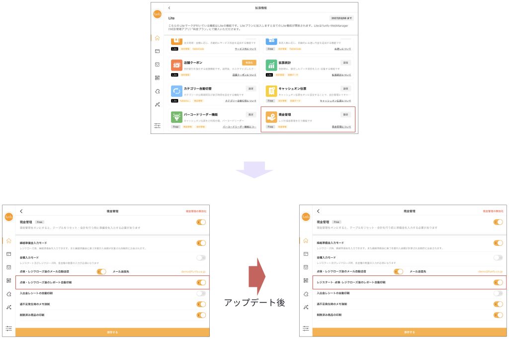これまでの「点検・レジクローズ後のレポート自動印刷」は、今回のアップデートにより