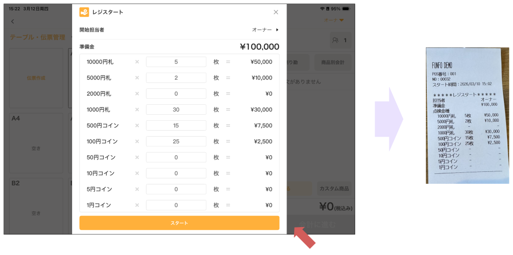 本機能により、レジ業務を開始する際の準備金や担当者情報を紙で確認・記録できるようになります。