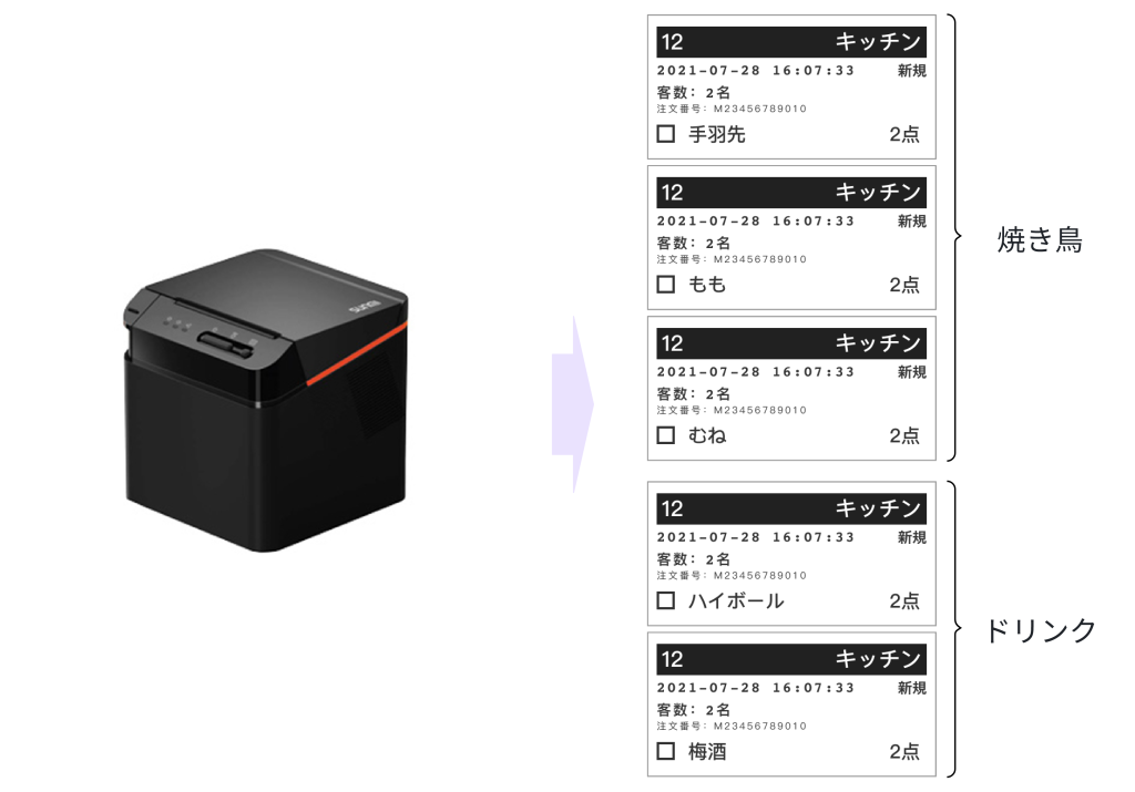 厨房の役割分担がはっきりしている店舗(ドリンク担当・フード担当など) → ドリンクやフードがまとまって印刷されるため、そのまま各担当に伝票を渡しやすくなり、仕分けの手間が減ります。 本機能の設定方法や具体的なご利用方法につきましては、「機能の詳細について」をご参照ください。