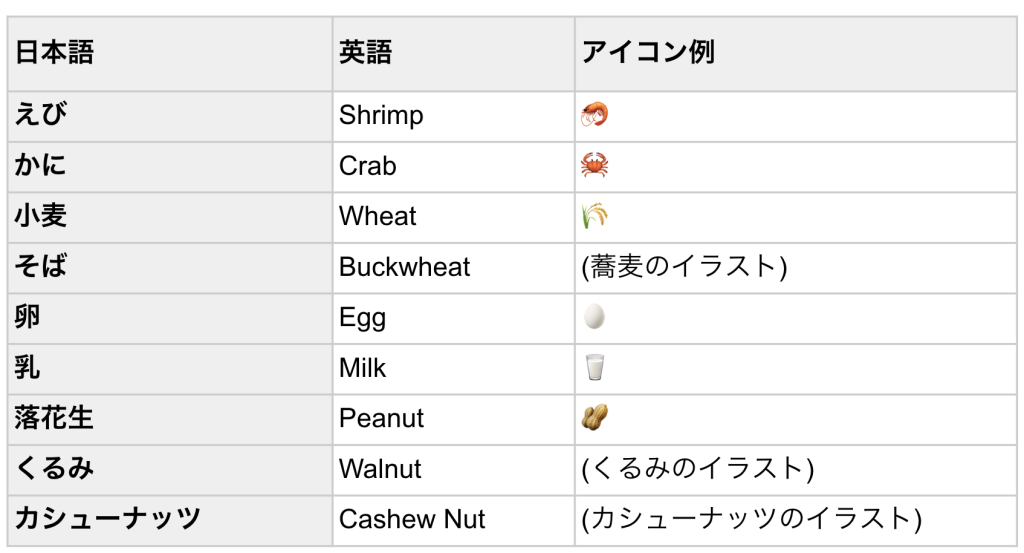 日本では特にアレルギーを引き起こしやすい特定原材料8品目(えび、かに、くるみ、小麦、そば、卵、乳、落花生)の表示が重要です。2025年からは「カシューナッツ」も義務化対象に追加されるため、早めの対応が推奨されます。