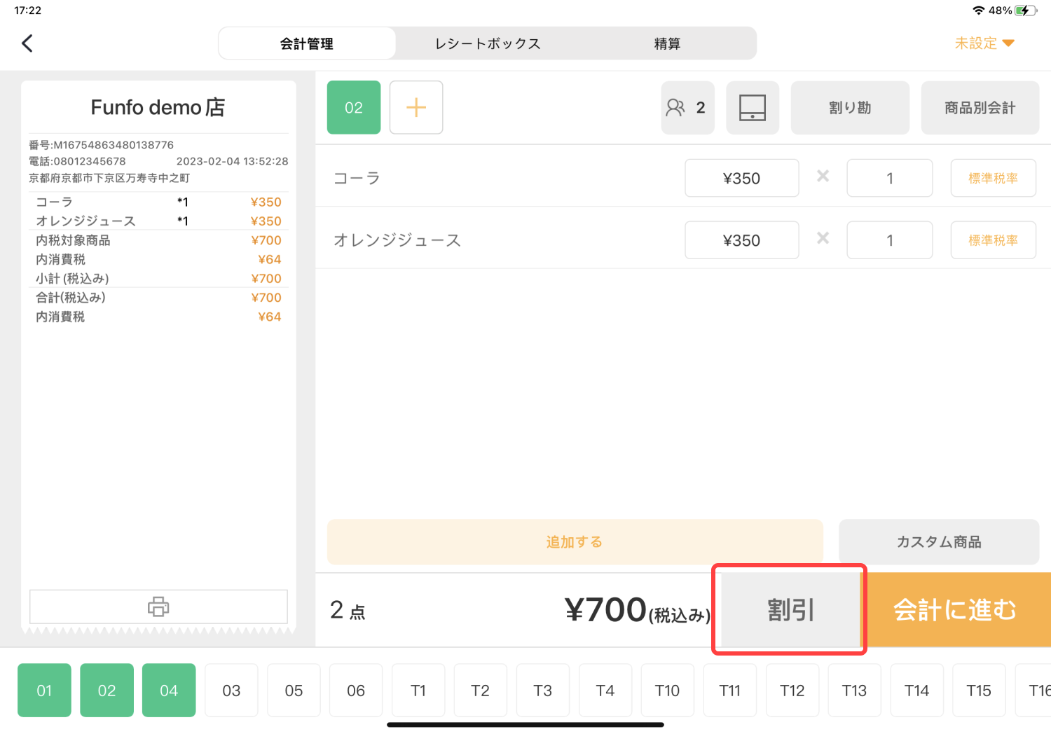 作成したクーポンは会計管理画面の割引にて簡単に適用することができます。パーセンテージクーポンの場合は、金額が自動的に算出され、会計金額に反映されます。