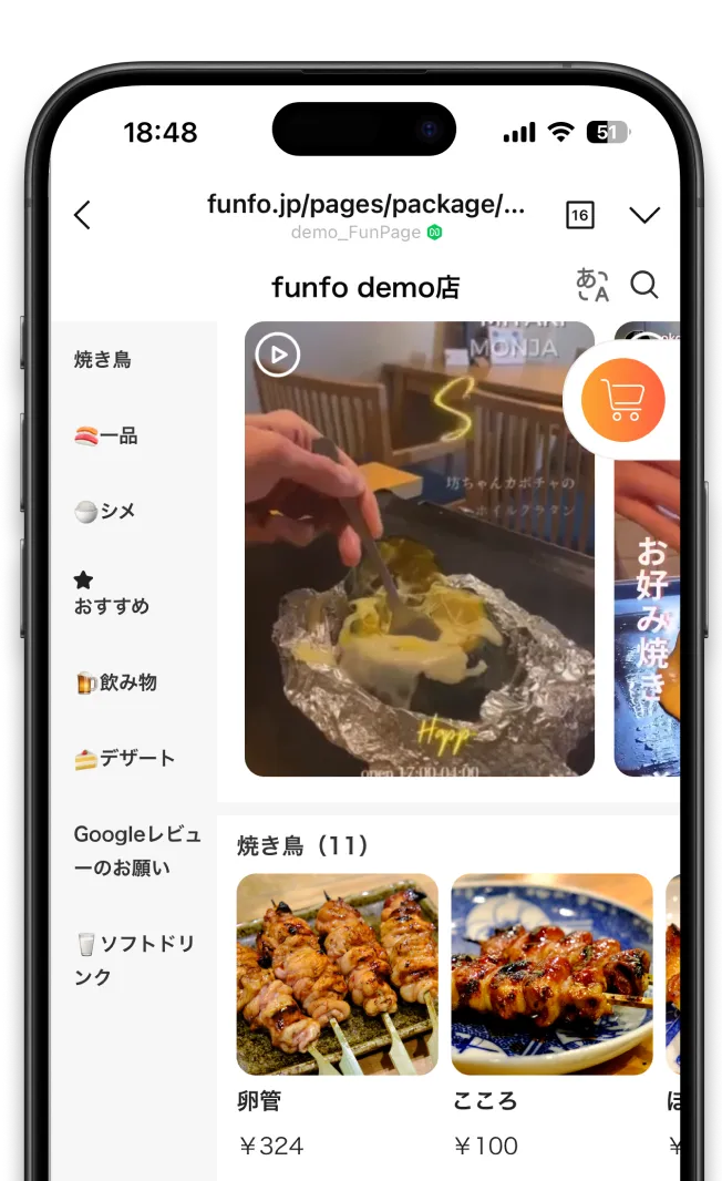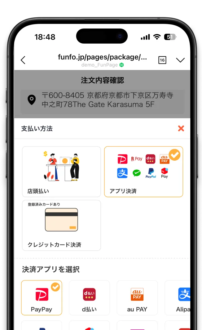 Point 03支払い方法の保存ユーザーIDと関連して暗号化した支払い情報を保存し、2回目以後の注文はただ商品を選択し、送信するだけ!レジに並ぶことなく注文できるオーダースタイル及びfunfoならではのユーザー体験は客単価の向上に大きく貢献します。